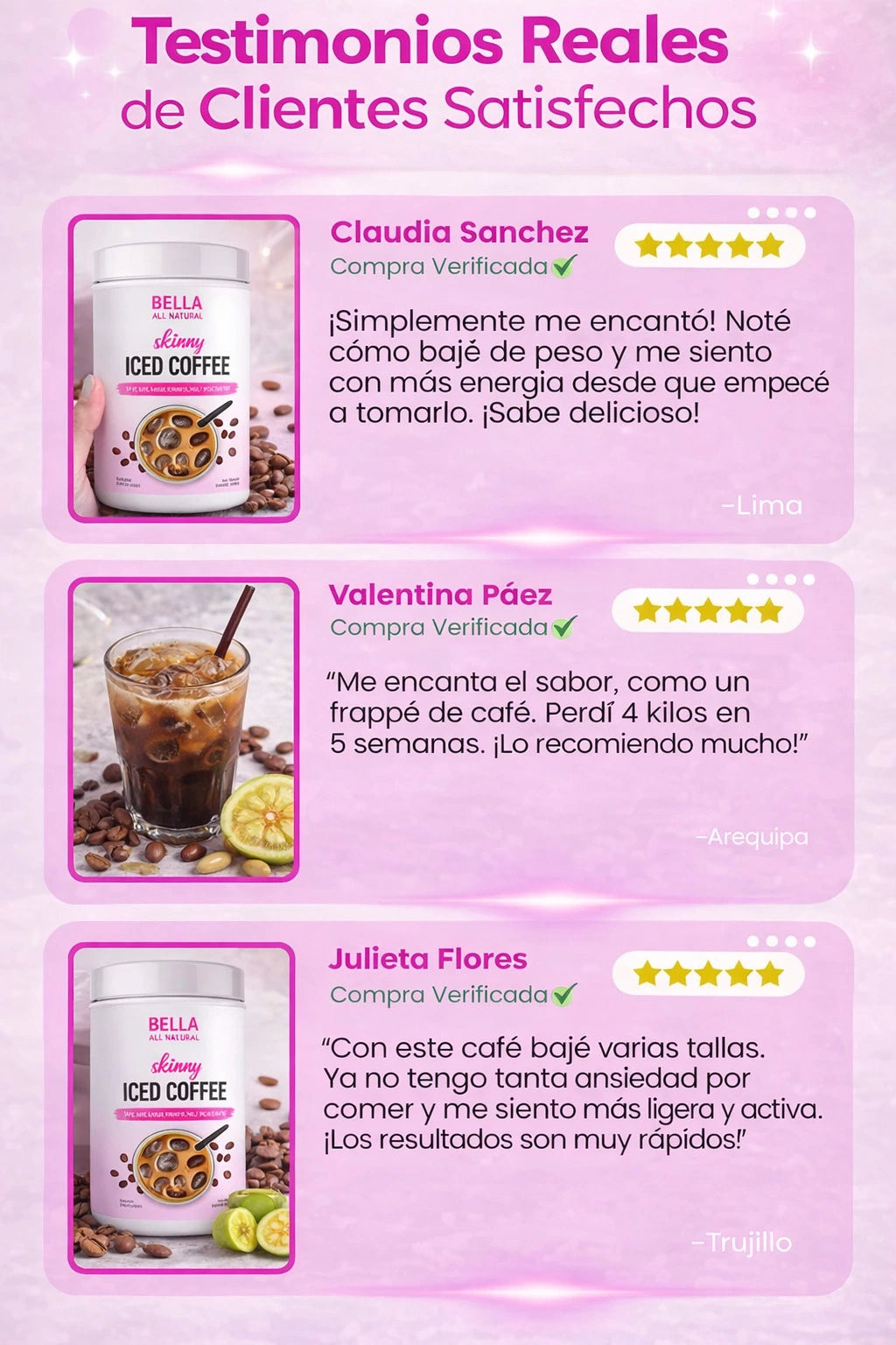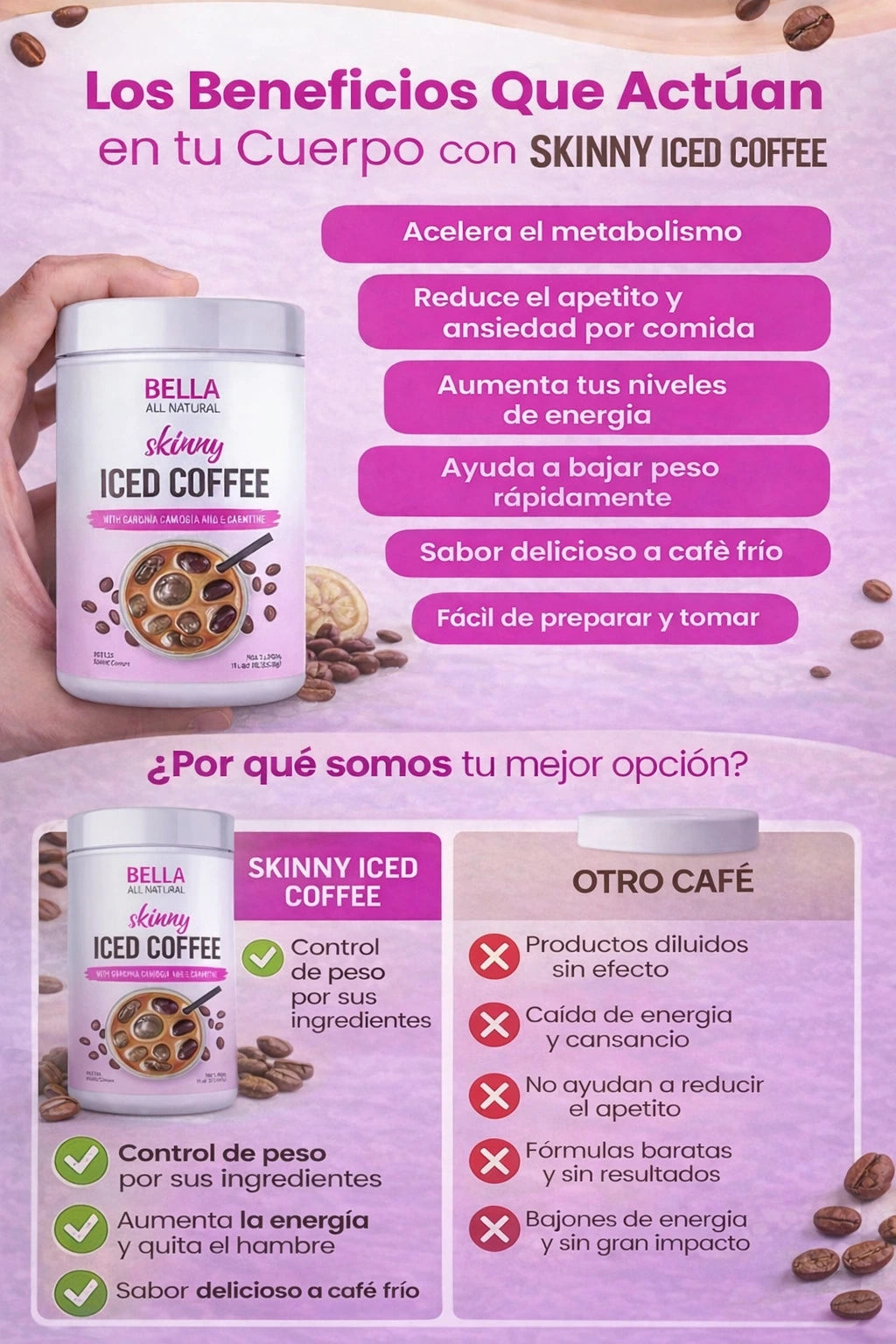 Skinny Iced Coffee es un café helado funcional hecho con café arábica de alta calidad y superalimentos como Garcinia Cambogia y L-Carnitina, diseñado como reemplazo de un café regular con beneficios adicionales para apoyar el control de peso y energía durante el día.