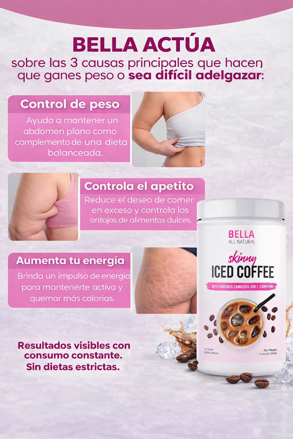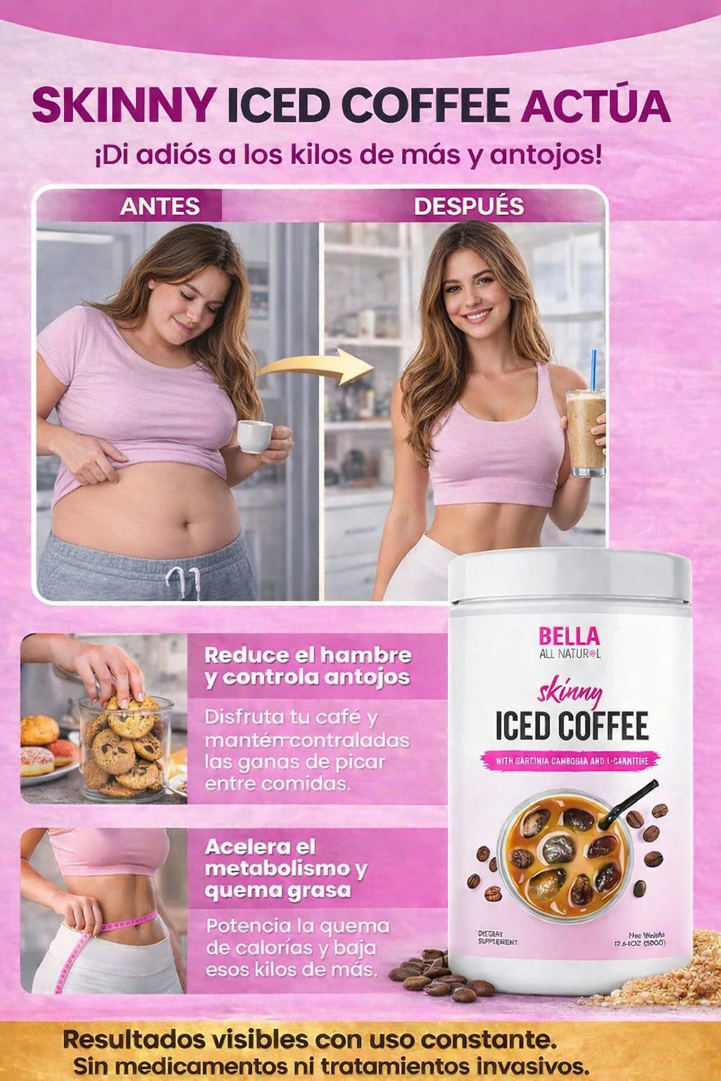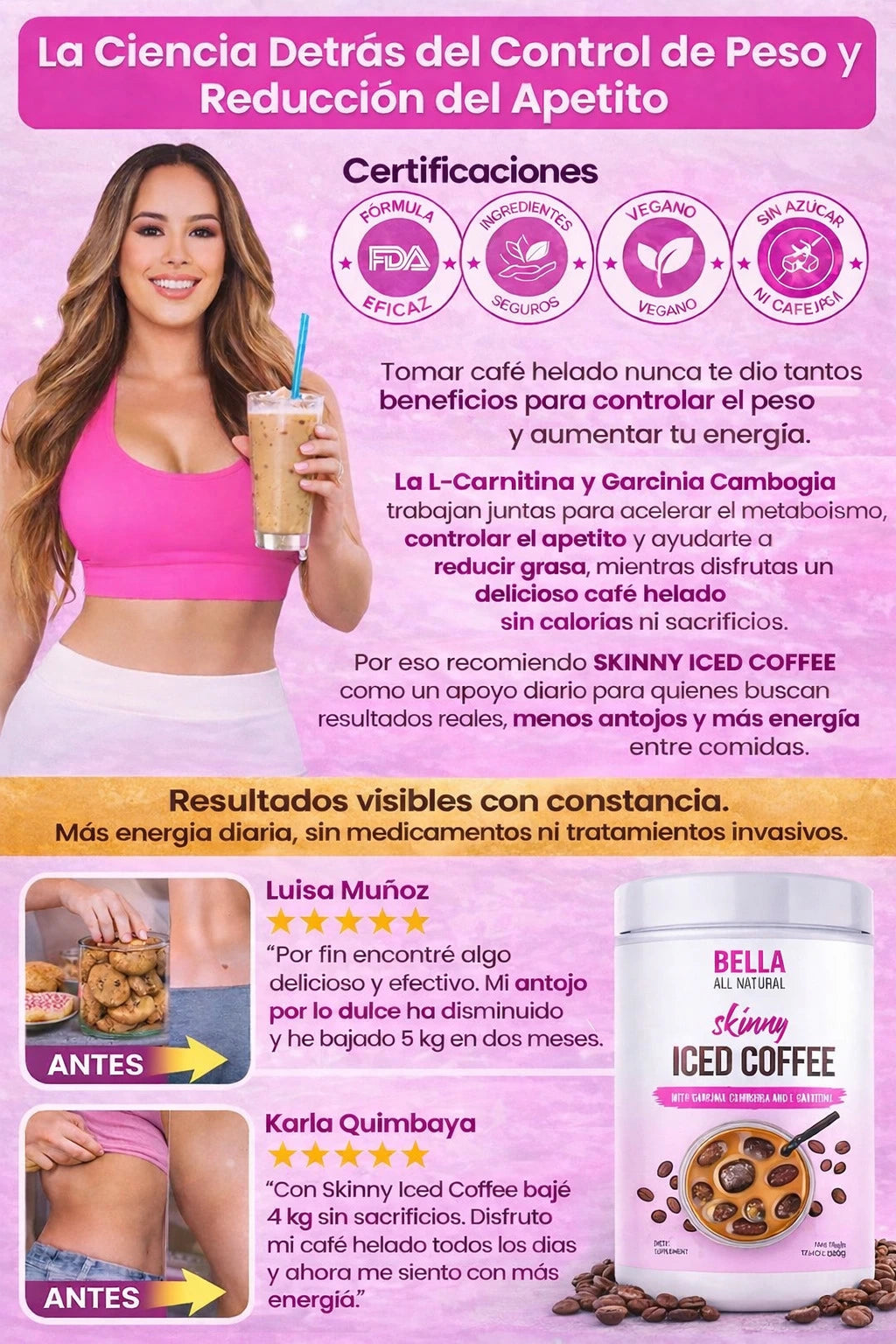 Los beneficios provienen de sus ingredientes clave: L-Carnitina y Garcinia Cambogia, que ayudan a facilitar el uso de ácidos grasos como energía en lugar de almacenarlos, mientras disfrutas un café frío delicioso.